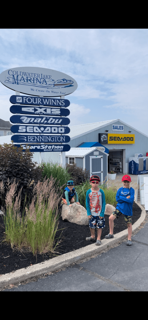 Coldwater Lake Marina does offer rentals longer than one day so if you aren’t local and are looking to head to southern Michigan, I would highly recommend checking them out. Overall, I would give it 8 out of 10 stars. The biggest thing I wish they would have provided was the sandbar augers to keep the pontoon in place. At our first sandbar stop, there was no issue because it was Monday morning, and not a whole lot of boat traffic so we could set up using the anchor. We were far enough away from other boats that the movement of the waves didn’t really impact us at that time. However, in the evening when we wanted to stop at a different sandbar we couldn’t. It was busier and the location of that sandbar had more waves due to the boat traffic. While we tried it didn’t take long than a minute to realize it just wasn’t going to be safe or practical. The boys were pretty bummed because there were other kids their ages out fishing on that one and they wanted to go fish with them. The only other thing that would have been nice is a more detailed map of the entire chain, specifically locations that have public bathrooms, food, gas, etc. They did provide a map of low water areas which was much appreciated, and this is a bit more nitpicky, but this blog is meant to help other families plan adventures. And bathroom breaks are something all parents have to deal with.
